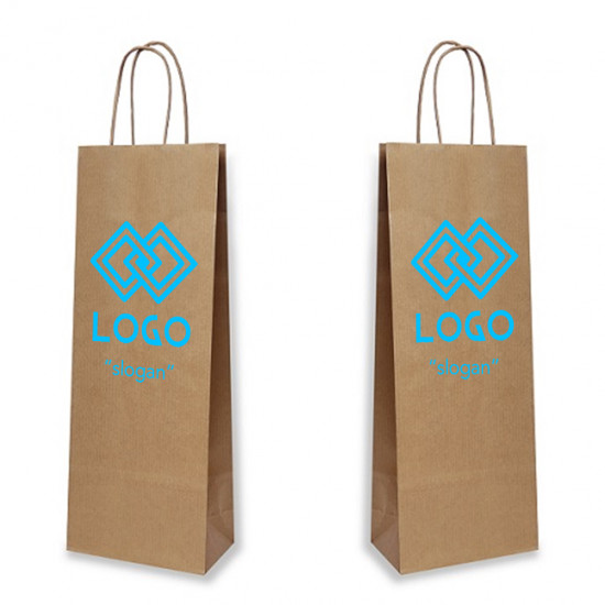 Kies onze bedrukte flessentas in bruin kraft als het perfecte reclamemiddel voor uw bedrijf! Deze elegante papieren wijntas met gedraaide handvatten is ideaal voor het verpakken van flessen wijn, champagne of andere dranken, waardoor het een effectief promotieartikel wordt voor uw onderneming én een origineel geschenk voor klanten en relaties. Gemaakt van hoogwaardig kraft papier en volledig personaliseerbaar met uw logo, tekst of design, biedt deze tas de perfecte combinatie van functionaliteit en merkpromotie.